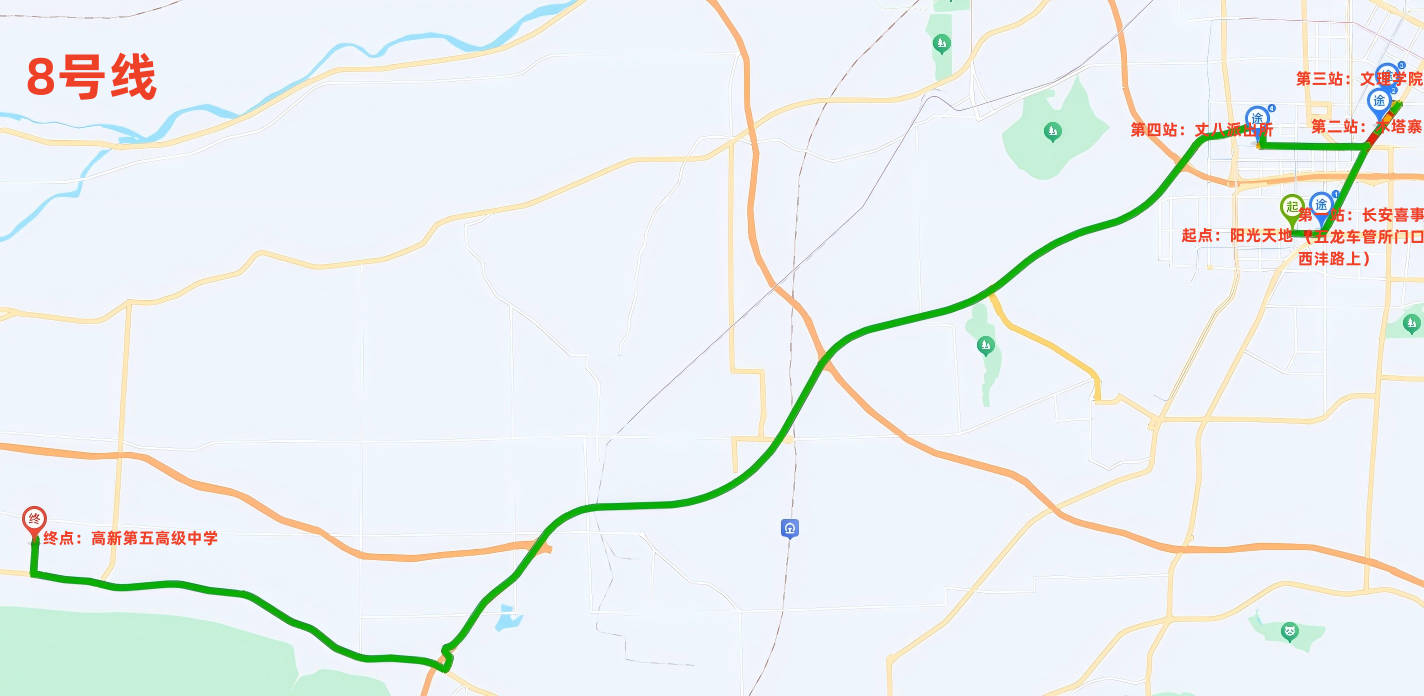 西部大道→西沣北路→太白南路→科技六路→太白南路→丈八东路→丈八西路→丈八六路→科技八路→京昆高速→关中环线→振兴路